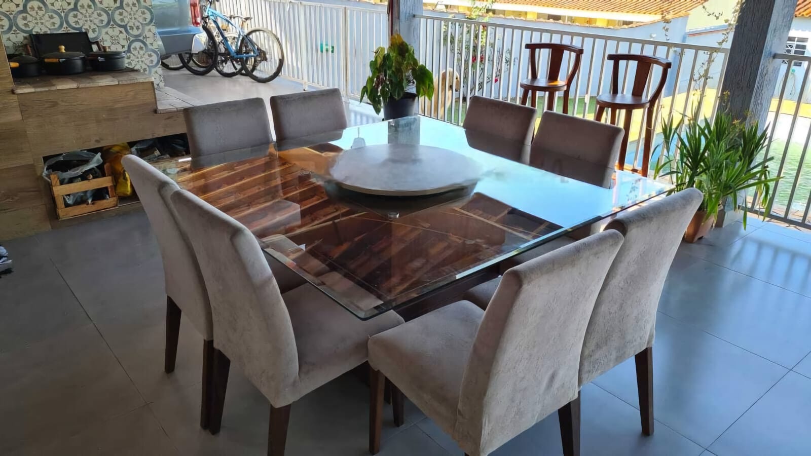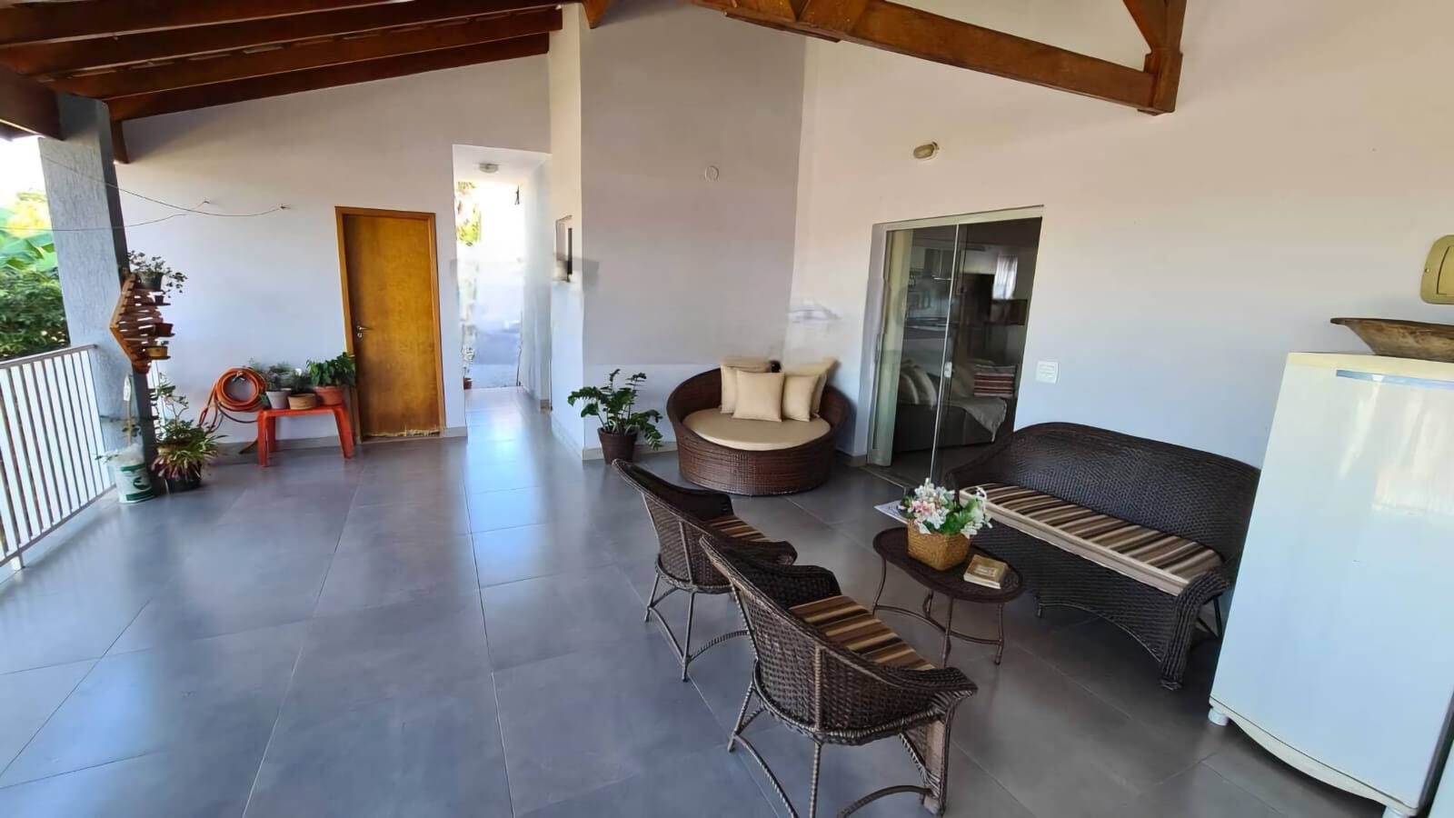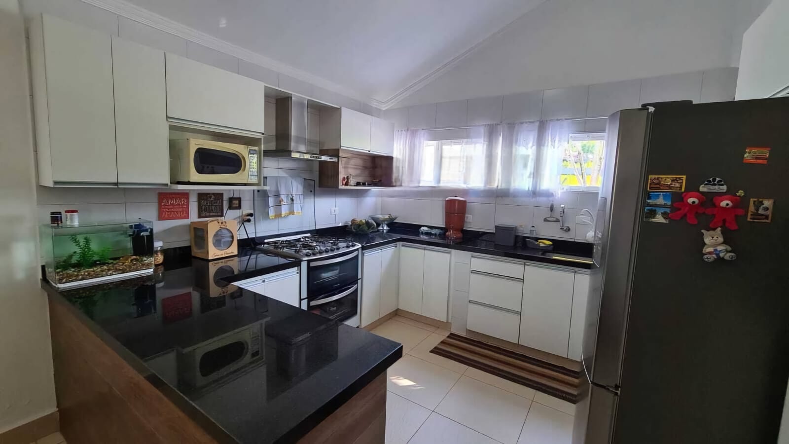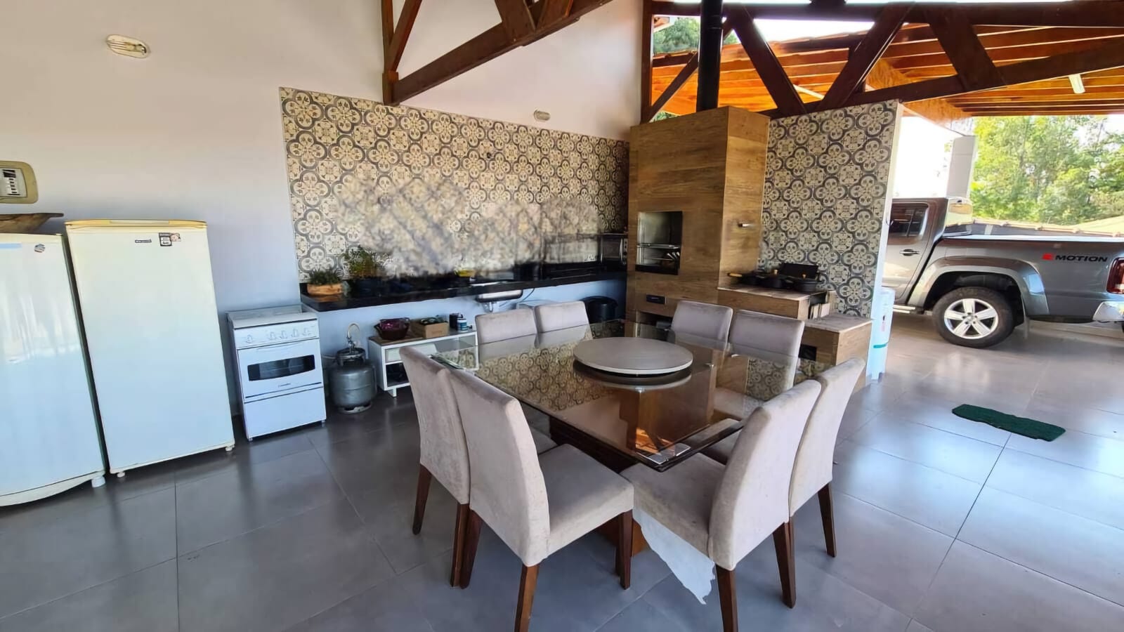 Tem piscina, garagem , área gourmet com churrasqueira e fogão a lenha.